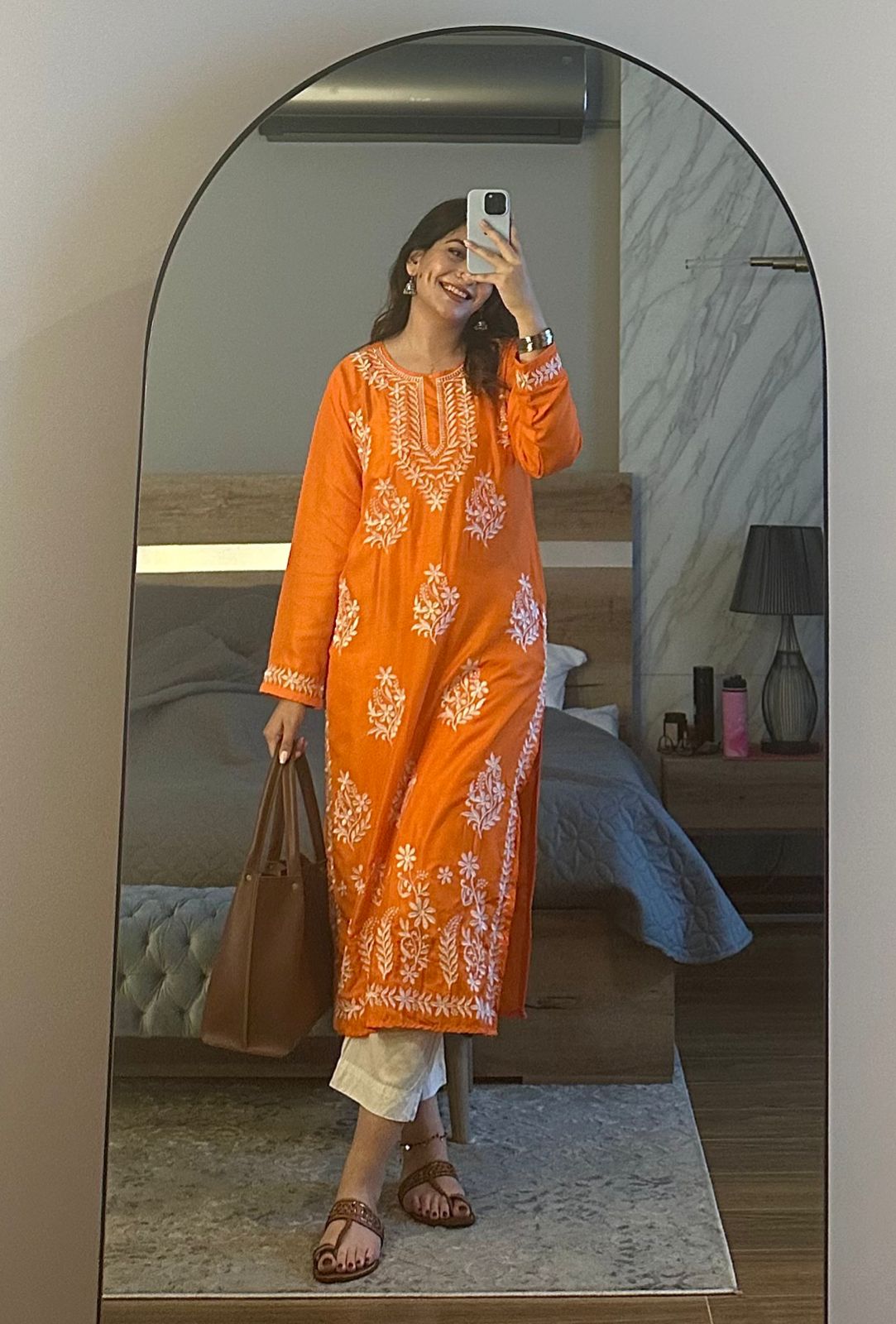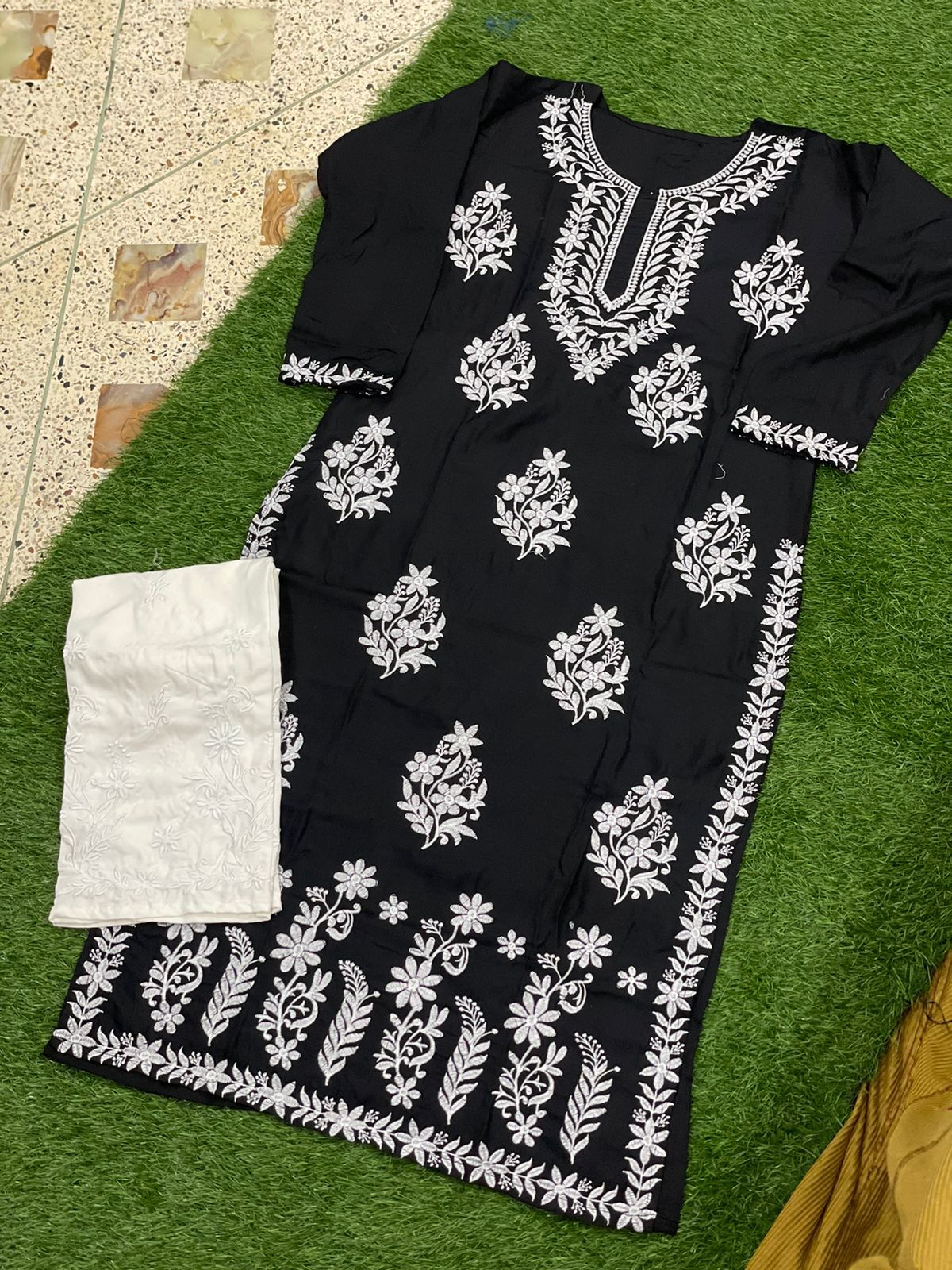 Product Details:- A summer friendly stitched suit with beautiful trouser white embroidery trouser giving a chikankari look.
