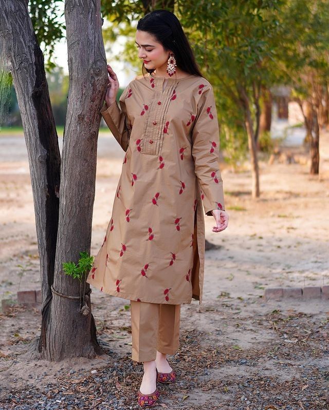 A 2pcs stitched with fine quality lawn fabric for your summers with beautiful embroidery red leaves bunches all over sleeve and front.