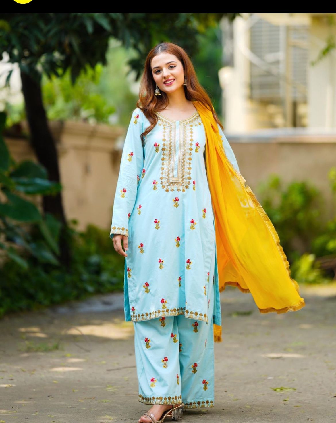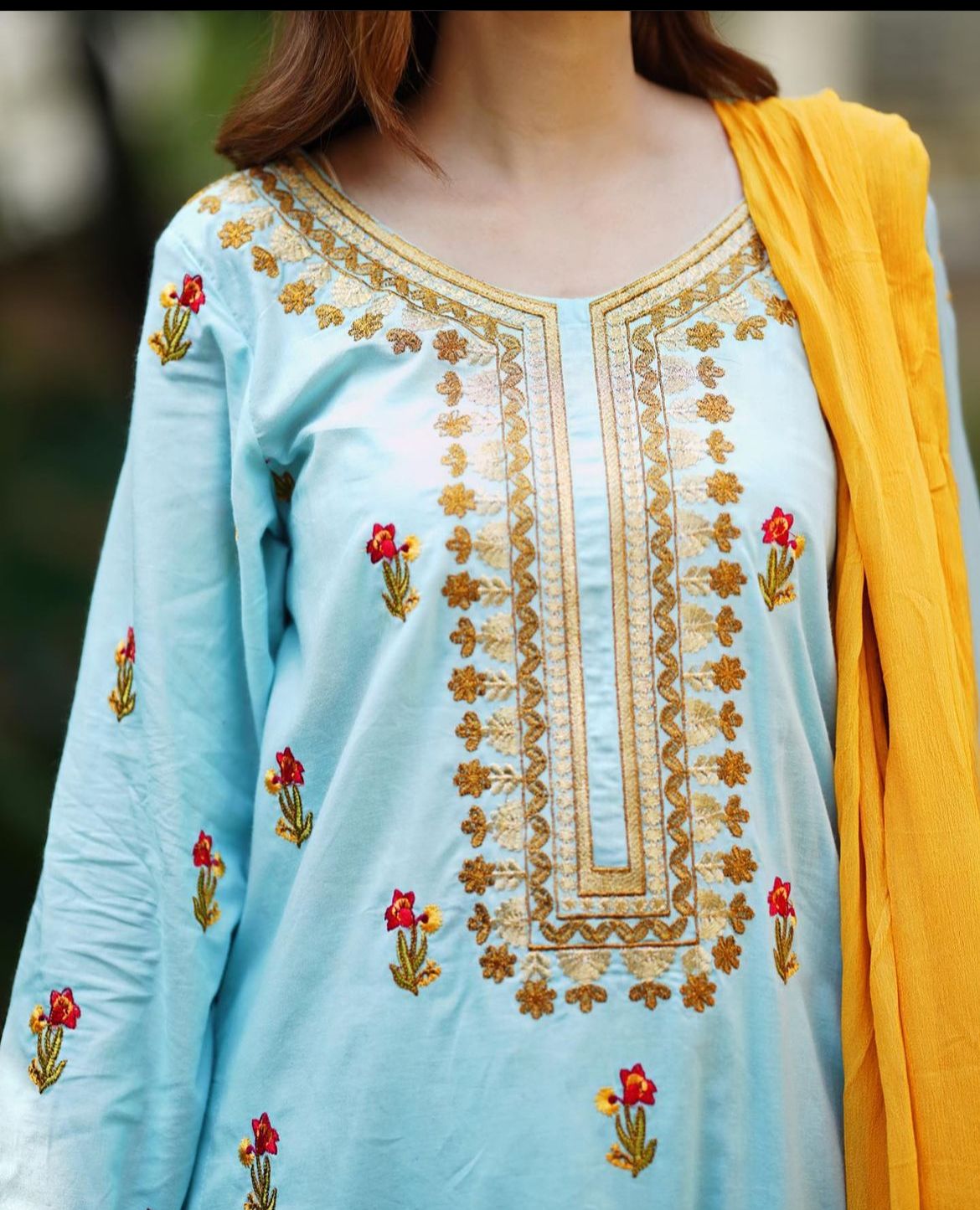 Product Details:- A cute ferozi shade 3pcs suit stitched in with colour full embroidery red and yellow and a flapper trouser giving comfy look.