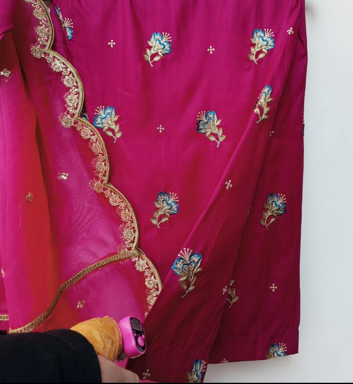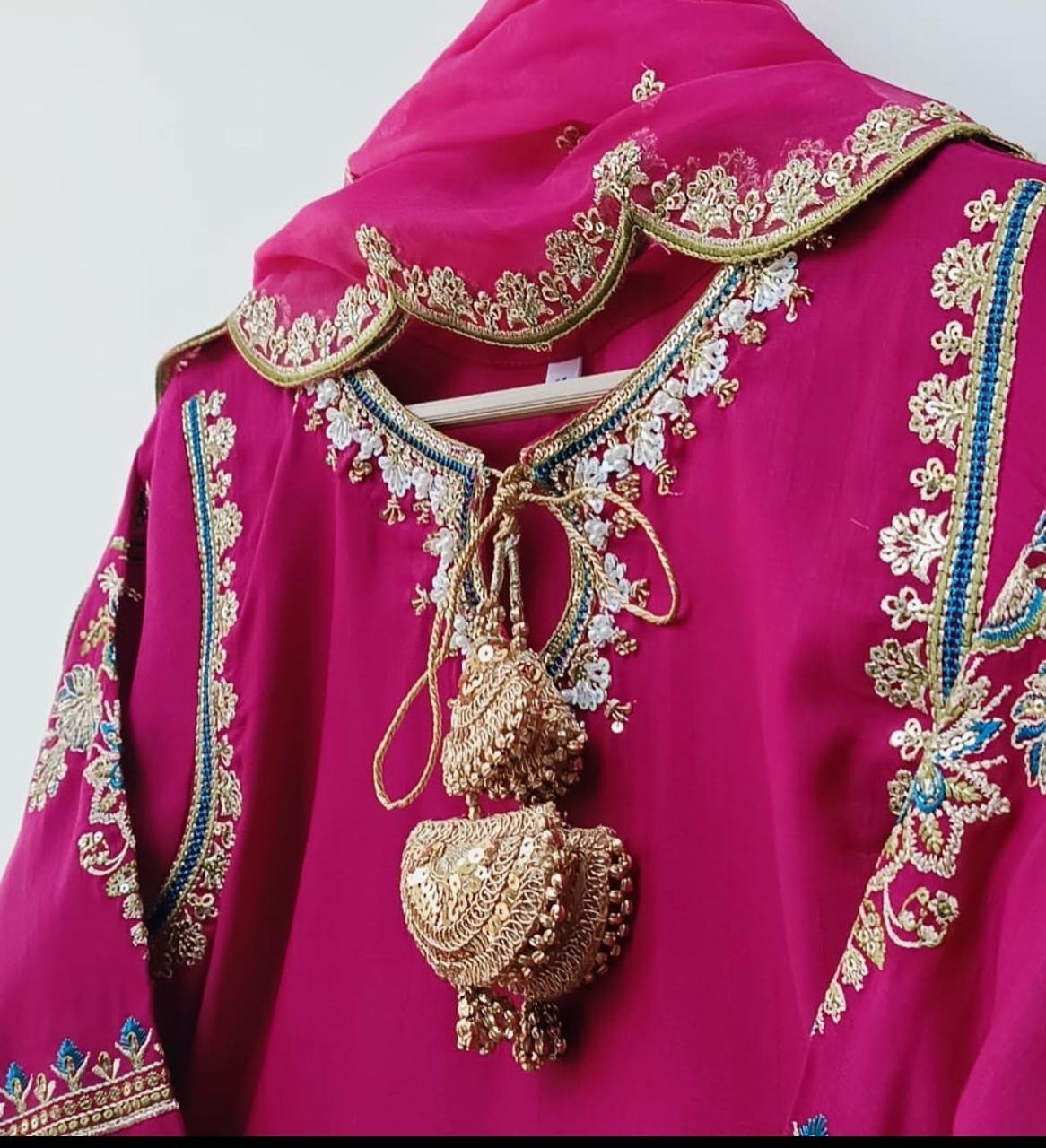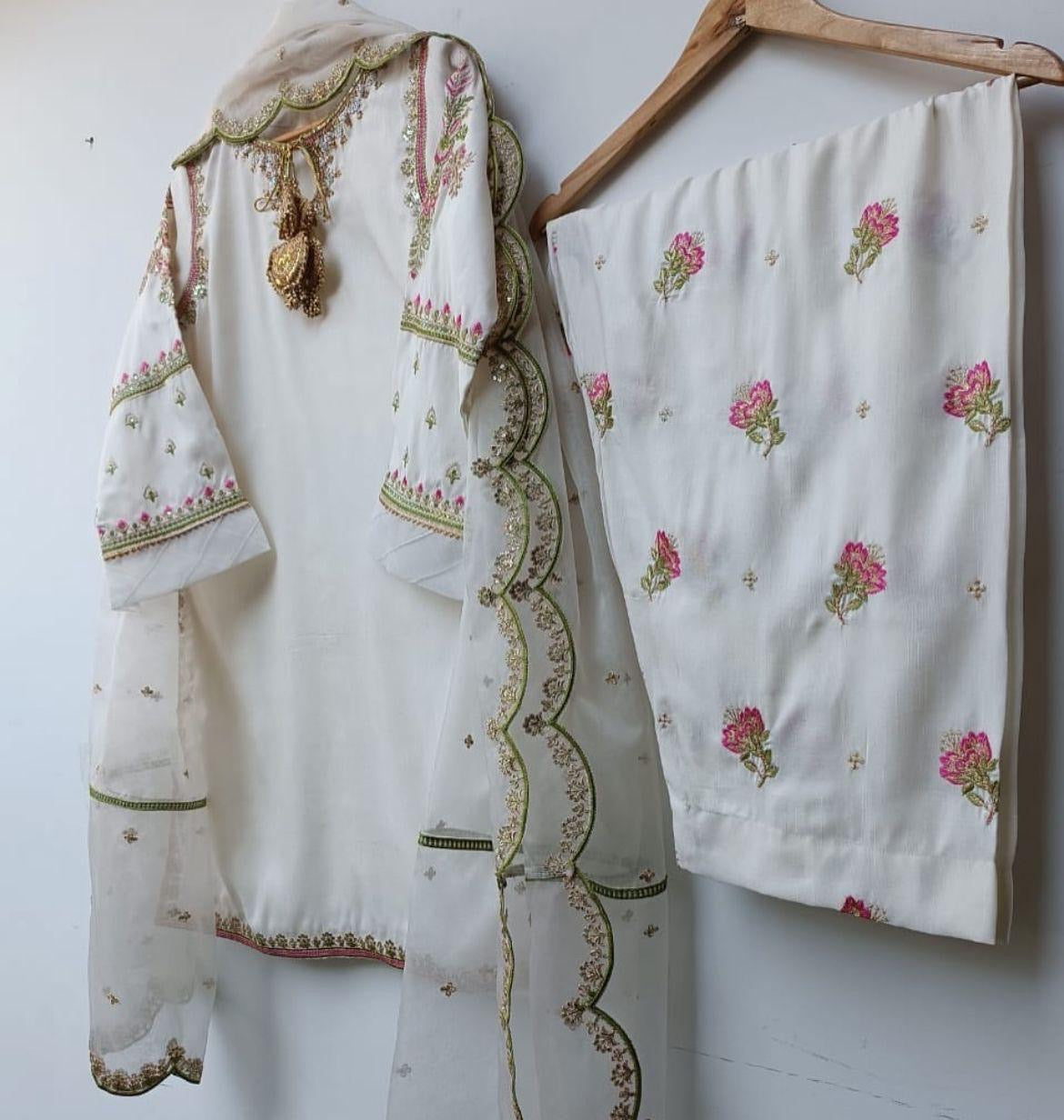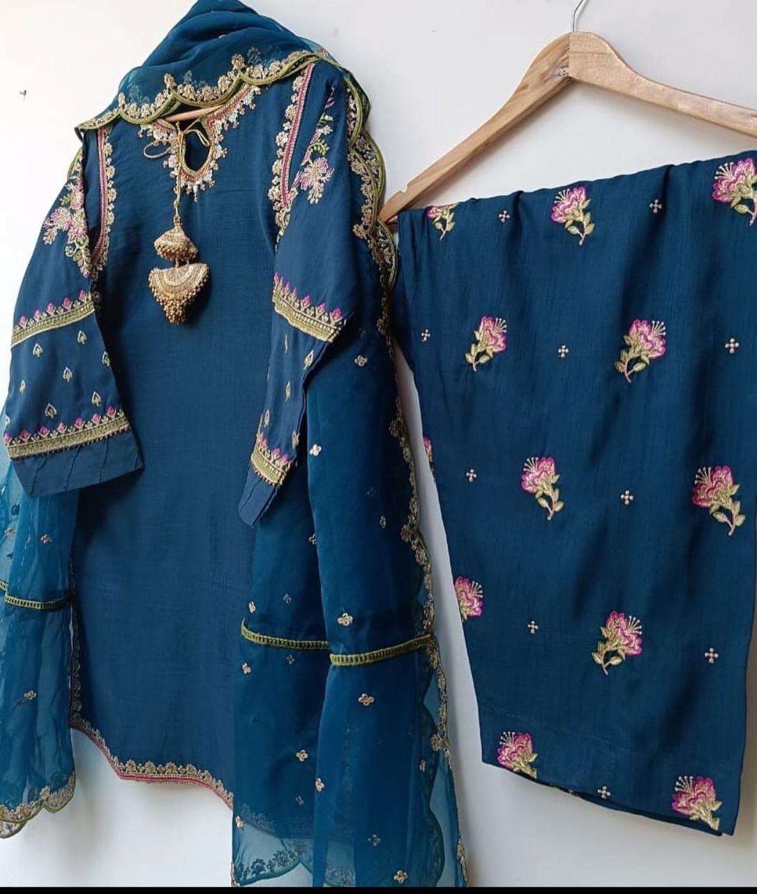 Embrace timeless elegance in this exquisite teal shalwar kameez. Crafted from luxurious raw silk, the intricate embroidery and scalloped edges create a truly captivating look. The sheer organza dupatta adds a touch of ethereal beauty, making this outfit perfect for any special occasion.