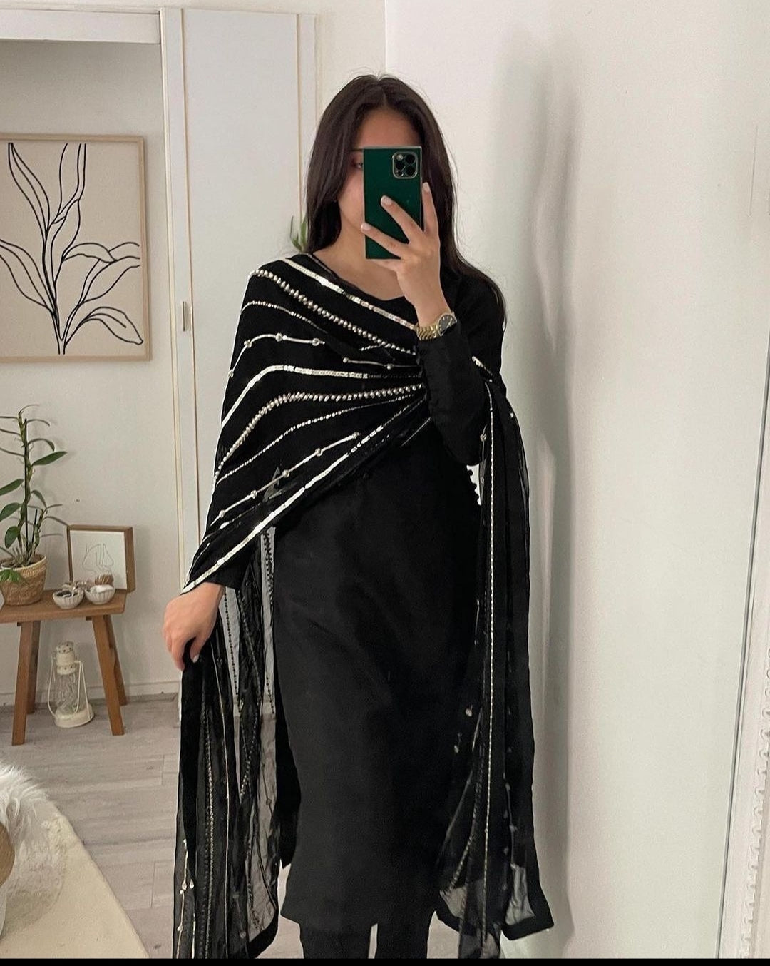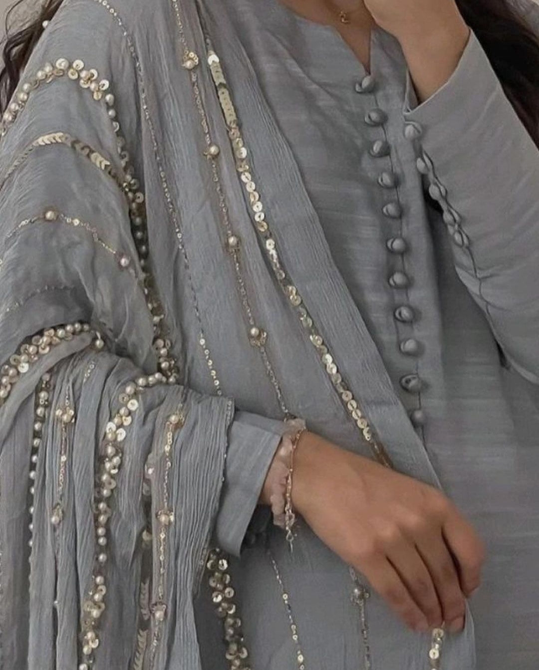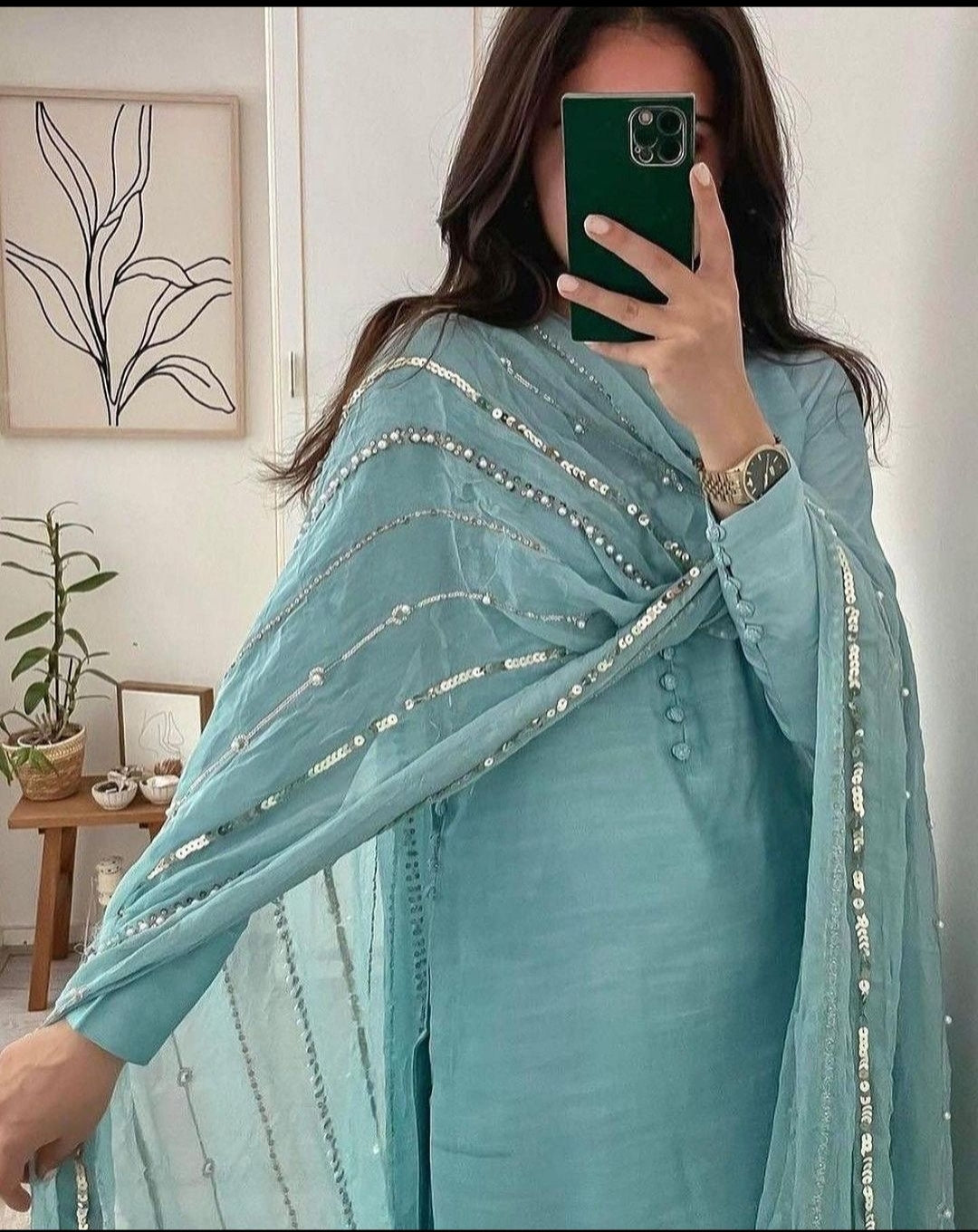 Product Details:- A long and elegant, decent kurta with side button and front button work on raw silk Chiffon handwork duppata.