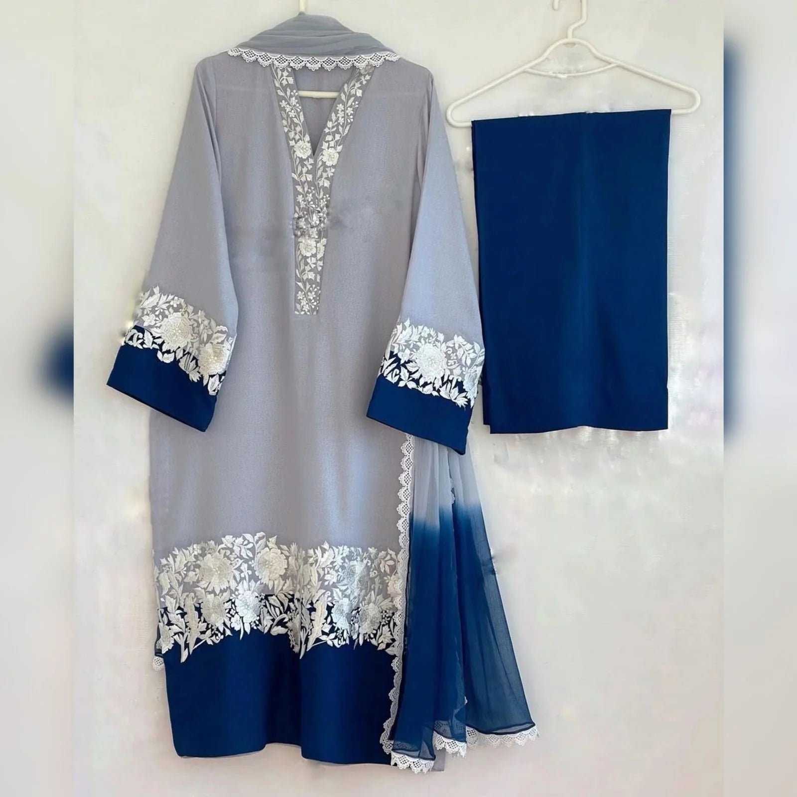 Georgette elegance meets tie-dye charm! Elevate your style with this shirt and trouser set, paired with a mesmerizing tie-dye dupatta and delicate four-sided lace detail. 💫